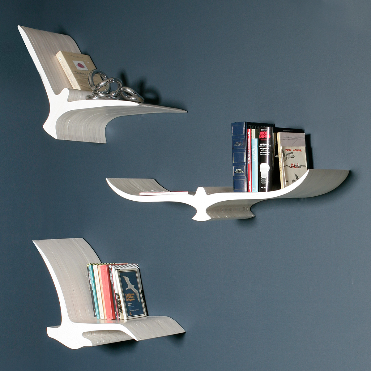 description: In Volo by Andreea Ioachim & Fabio Pedaletti. Set of shelves composed by three modules representing seagullshovering in the air. Flight as expression of freedom. Books as a means of elevation, inviting the reader to soar through the spaces of the mind, embark on voyages of the imagination, traverse universes of thought and possibility. Combined, these two concepts yield a flock of free form shelves that are conceived of seagulls hovering in the air.