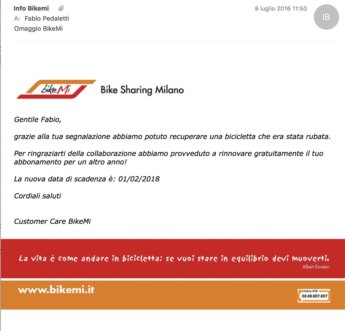 Un paio di giorni prima del mio compleanno, mi è arrivata una mail in cui mi avvisano che la mia segnalazione gli ha permesso di recuperare una bici rubata, pertanto mi regalavano un anno di abbonamento.